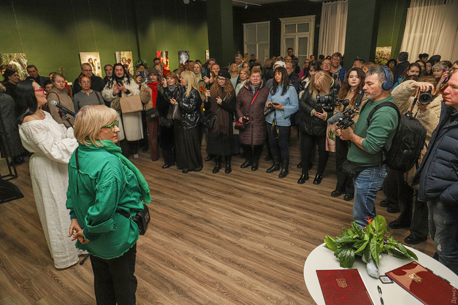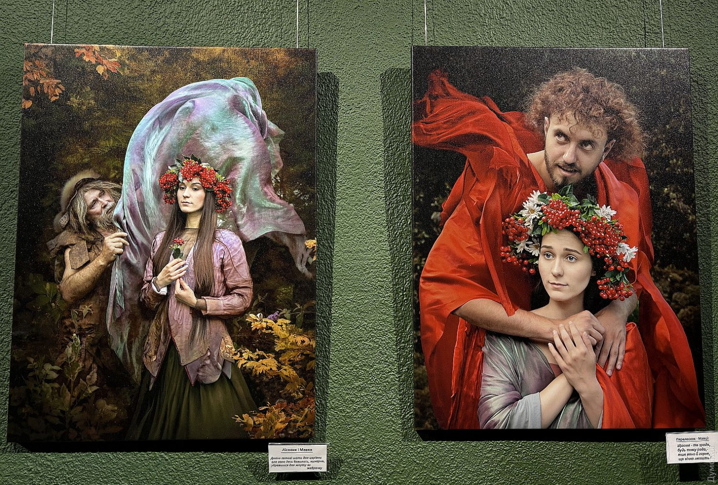 Фотопроект Елены Мартынюк «Лесная: свобода быть собой» до 29 марта работает в Международном культурном центре Union в рамках культурной инициативы Odesa-ID. Это невероятно красивое и целостное художественное высказывание о свободе как внутреннем выборе, о праве оставаться живым в мире, постоянно искушающем компромиссами. Заслуженная художница Международной федерации фотоискусства (FIAP), призер, победитель, дипломант и лауреат многочисленных международных и отечественных выставок Елена Мартынюк, обращаясь к философскому ядру драмы «Лесная песня» Леси Украинки, словно о себе говорит. Ведь она с начала полномасштабного вторжения покинула комфортную московскую студию и вернулась в родной город, к матери и сыну. Не смогла делать парадные портреты тех, кто хочет «спасать» Одессу. Проект реализован совместно с Одесским академическим украинским музыкально-драматическим театром имени Василия Василько. Актеров для участия в проекте привлекла Юлия Пивоварова, директор-художественный руководитель театра, а куратором проекта стала советник Одесского городского головы на общественных началах Елена Павлова. Празднование 155-летия со дня рождения Леси Украинки продолжилось не лишенным мистики, как, впрочем, и вся «Лесная песня», художественным событием. «Наши прекрасные актеры не боялись озер, фонтанов, жаб, диких собак, а доверились художнице, — говорит завлит «васильковцев» Светлана Бондарь. — Гримеры, костюмеры – все были задействованы, ведь создавали драму-феерию! И я видела, как зрители узнавали в этих фотокартинах что-то свое». Елена Мартынюк рассказала, что херсонские жабы после аварии на Каховском водохранилище приплыли по морю, натерпелись лиха, чего ж их бояться. Наоборот, чуткие одесситы спасли их, доставили в Ботанический сад Одесского национального университета имени И. И. Мечникова, где они обитают в фонтане. Этот фонтан во время съемок превратился в пруд, куда бесстрашно погружались Русалка (Ульяна Самолюк) и Тот, кто плотины рвет (Сергей Корнейко). А вот кого действительно испугались, так это черного пса, который неожиданно присоединился к съемочной группе в Дюковском парке. Ведь известно, что в таком обличье в мир людей может приходить нечистый, да и герой «Лесной песни» Лукаш превращался в волка-оборотня. Мавка (Тамара Лукаш) как раз печалилась на могиле дядьки Лева (народный артист Украины Игорь Геращенко именно в этом кадре не был задействован), сюжет понуждал к опасениям. Но все обошлось. Был в проекте и самый настоящий волк, которого нашли в зоопарке и отсняли без проблем, хищник там родился и к людям привык. Красавец Лукаш (Ярослав Бабич) искренне обрадовался, когда во время позирования к нему прилетела стрекоза, к Мавке слетались бабочки. А еще к актерам постоянно присоединялись коты. «Где уж точно была мистика, так это в кадрах с Русалкой Полевой, — признается Елена Мартынюк. – Когда мы спохватились, на полях не осталось спелых колосьев, одна стерня. Насилу нашли клочок поля за Нерубайским, сплели для Анастасии Лукьяновой веночек из васильков, посадили ее в рожь и отсняли. На следующий день и эти колосья исчезли. Повезло». Съемки длились с весны до начала зимы, и силы природы ощутимо стремились к художественному взаимодействию, приобщаясь к творческому процессу. Видимо, иначе и быть не могло с этим сюжетом.