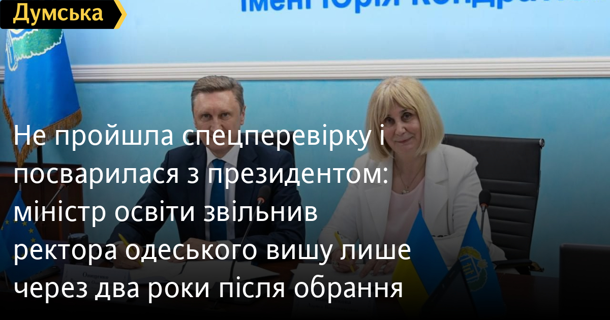 Не пройшла спецперевірку і посварилася з «президентом»: міністр освіти звільнив ректора одеського вишу лише через два роки після обранняДостроково розірвати контракт із ректоркою Одеського національного технологічного університету Ларисою Іванченковою вирішив міністр освіти і науки України Оксен Лісовий. У розпорядженні редакції «Думської» опинилася копія його наказу, підписаного 23 серпня. В ньому зазначається, що ректорка, яка перемогла на виборах 2022 року, не пройшла спеціальну перевірку. Іванченкова вважалася ставленицею колишнього ректора Богдана Єгорова, який зараз обіймає вигадану ним же посаду президента навчального закладу, однак, за чутками, з рік тому вони посварилися. Єгоров очолював виш довгих 18 років, коли він ще був Національною харчовою академією. 2021 року він домігся її реорганізації в технологічний університет, розраховуючи в такий спосіб «обнулитися» і балотуватися на новий термін, однак у Міністерстві освіти і науки такий фінт йому зробити не дозволили. Тоді він своїм наказом (!) створив посаду президента ОНТУ, яку благополучно обійняв. Згідно з положенням про президента університету, він, окрім іншого, визначає стратегію розвитку вишу, бере участь у засіданнях ректорату та вченої ради, може виносити на їхній розгляд будь-які питання, призупиняти дію будь-якого рішення ректора або ректорату з подальшим винесенням цього питання на розгляд вченої ради. За президентом закріплюють кабінет і службову машину. Президент університету обирається конференцією трудового колективу університету строком на сім років відкритим (підняттям рук) або таємним голосуванням, ідеться в документі. Зазначимо, що Закон України «Про вищу освіту» не передбачає наявності такої посади, як президент вишу. СМЕРТЬ РОСІЙСЬКИМ ОКУПАНТАМ! Помітили помилку? Виділяйте слова з помилкою та натискайте control-enter