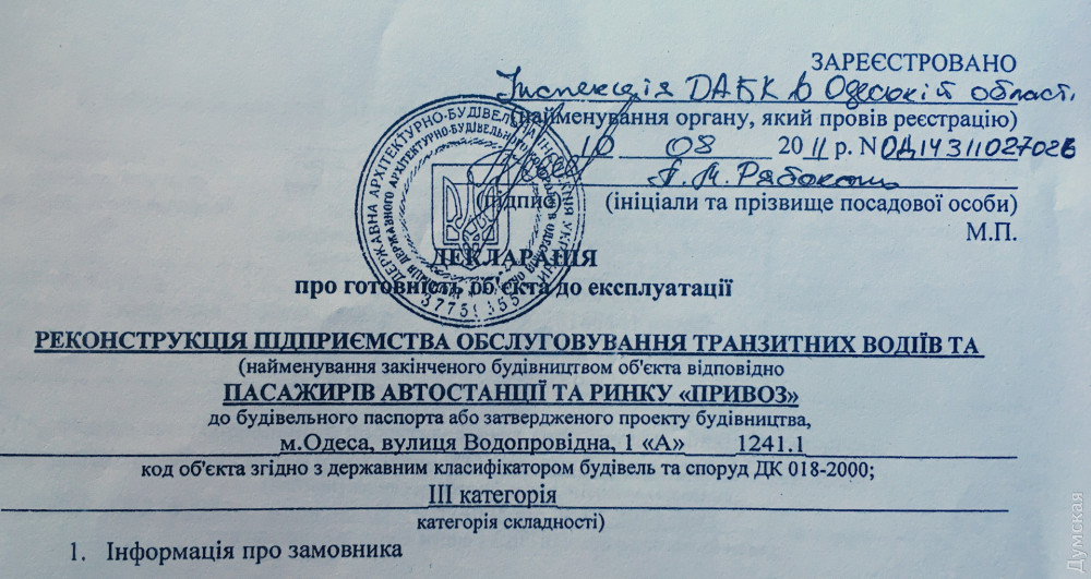 Деклараций, действительно, было пять, но две из них - о начале выполнения строительных работ (реконструкции) в зданиях, которые когда-то были частью трамвайного депо на Водопроводной. О готовности объекта к эксплуатации — три. Из них только в одной говорится о складских помещениях, а в двух — о «предприятии по обслуживанию транзитных водителей и пассажиров автостанции и рынка «Привоз». Подписаны документы тогдашним начальником областной инспекции ГАСК, а ныне вице-мэром Петром Рябоконем.