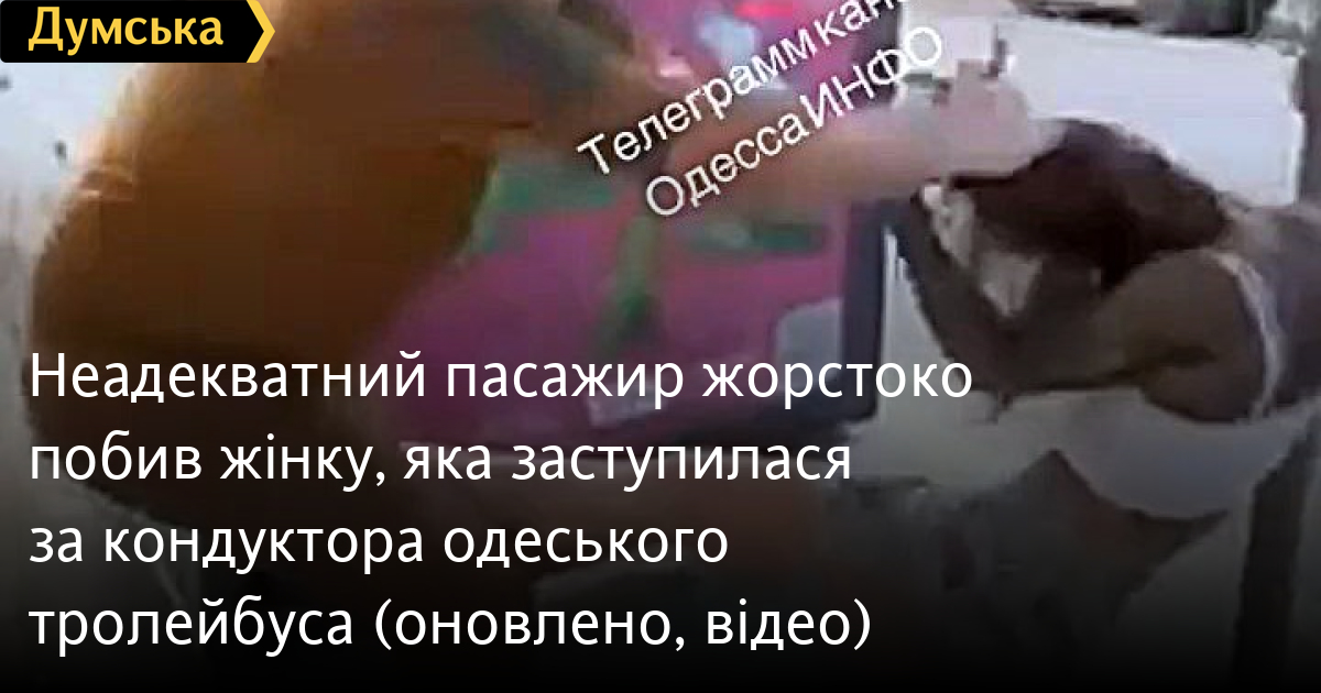 Неадекватний чоловік, імовірно співробітник охоронної фірми, жорстоко побив жінку в одеському тролейбусі. Відео нападу розмістили багато пабліків, а поліція вже почала провадження, передає кореспондент «Думської». Побиттю передувала перепалка в тролейбусі. Спочатку чоловік напав на жінку кондуктора, звинувативши в образі своєї дружини. «Вона, мою дружину, яка звільняла Ізюм, послала на х..й» — аргументував свої дії нападник.