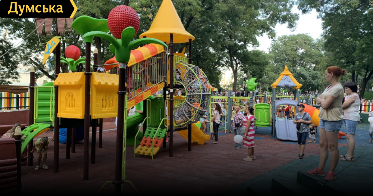 Главным элементом обновленной территории стал довольно большой игровой комплекс, который оборудовали на месте бывшего бассейна. Его площадь — почти тысяча квадратных метров. Строители обещали сделать «европейский детский городок». На фоне других одесских площадок получилось, конечно, неплохо.