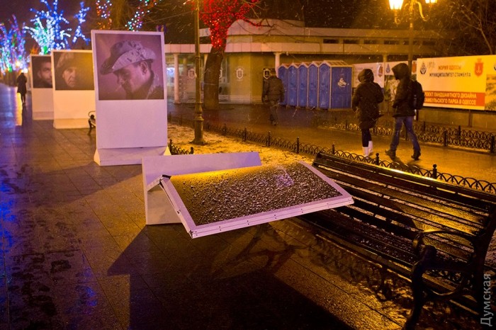 Неизвестные сломали один из стендов фотовыставки «Под защитой украинских военных», установленной на Приморском бульваре.
