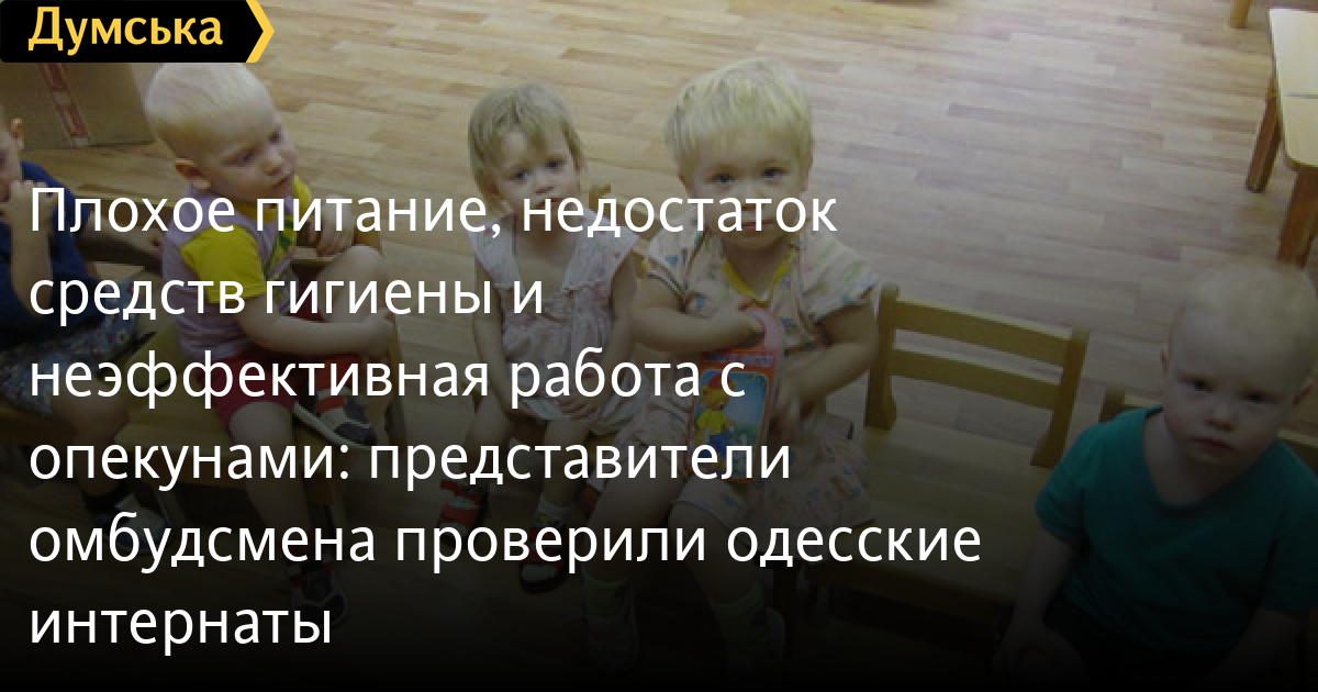 Плохое питание, недостаток средств гигиены и неэффективная работа с опекунами: представители омбудсмена проверили одесские интернатыПредставители омбудсмена нашли нарушения соблюдения прав ребенка, проверив детские дома и интернаты Одесской области. Как сообщили в пресс-службе омбудсмена, проверку устроили в детском доме «Жемчужинка», Одесском городском специализированном доме ребенка №1, Беляевском районном центре социально-психологической реабилитации детей «Надежда», Белгород-Днестровской специальной общеобразовательной школе-интернат №10 I-II ступеней. Так, в Беляевском центре социально-психологической реабилитации детей «Надежда» отсутствует системная работа психолога и материалы для развития и воспитания детей дошкольного возраста. Кроме того, здесь не соблюдены нормы питания детей, нарушены правила хранения продуктов, а также отсутствует надлежащее материальное обеспечение детей бельем, посудой и средствами гигиены. Проверяющие пришли к выводу, что в детском доме «Жемчужинка» и городском специализированном доме ребенка №1 созданы благоприятные условия для воспитания, однако там не реализуется право детей на воспитание в семье. «Мониторинг показал, что службы по делам детей неэффективно работают в направлении кандидатов в опекуны, попечители, приемные родители, родители-воспитатели с целью устройства детей-сирот и детей, лишенных родительской опеки, в семейные формы воспитания. Анализ сроков пребывания детей, устроенных временно, свидетельствует о длительном их пребывании в учреждениях от 7 месяцев до 2 лет», — отмечают в пресс-службе омбудсмена. Также проверка показала, что центрами социальных служб для семьи, детей и молодежи прекращается осуществление социального сопровождения семей, оказавшихся в сложных жизненных обстоятельствах, при этом дети продолжают находиться в заведениях и воспитываются вне семейного окружения. По результатам мониторинговых визитов готовятся соответствующие письма реагирования, с целью устранения нарушений. Читайте также: В одесском приюте: почти год над детьми издевался насильник. СМЕРТЬ РОСІЙСЬКИМ ОКУПАНТАМ! Помітили помилку? Виділяйте слова з помилкою та натискайте control-enter |