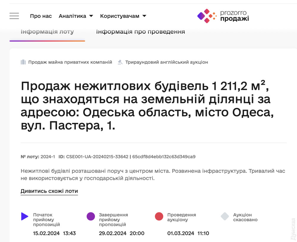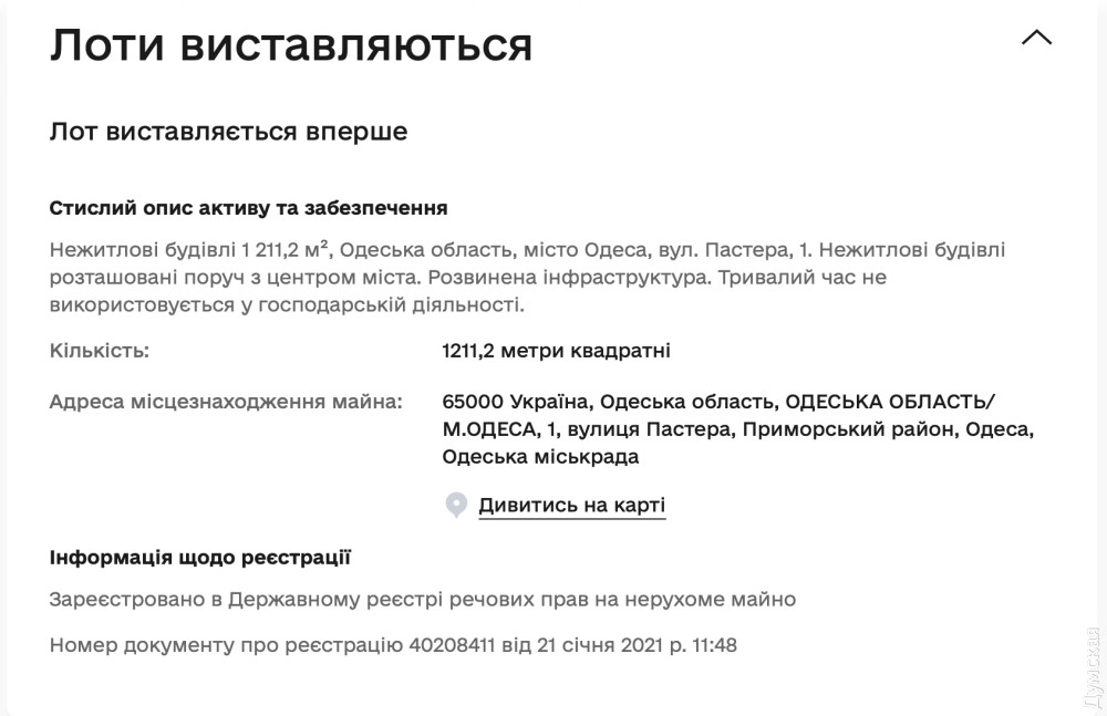 Оголошення розмістила 15 лютого в системі Прозорро.Продажі компанія «Мітрідат Одеса», якій зараз належить ця будівля, до речі, одна з найстаріших у місті — 1835 року побудови.