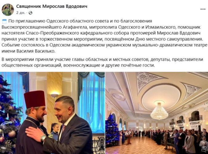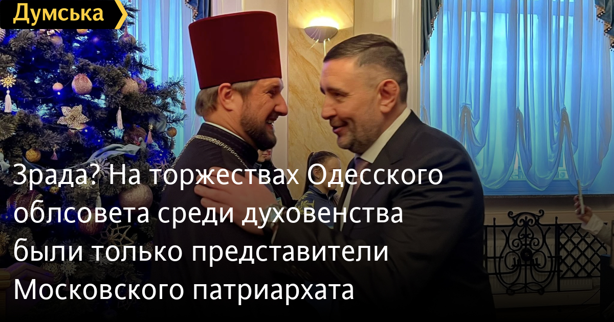 Зрада? На урочистостях Одеської облради серед духовенства були лише представники московського патріархатуПредставників Православної церкви України не запросили на урочисті заходи з нагоди Дня місцевого самоврядування в Одесі. Цю інформацію «Думській» підтвердив секретар Одеської єпархії ПЦУ Теодор Оробець. «Я не отримував запрошення. Владика Афанасій також», — сказав він. Згодом стало відомо, що на заході був присутній лише один представник духовенства — протоієрей Мирослав Вдодович, який працює помічником настоятеля Спасо-Преображенського кафедрального собору (Московського патріархату). Згодом він підтвердив у Facebook, що отримав запрошення Одеської облради та благословення Агафангела піти святкувати. Урочистості відбулись 7 грудня в українському театрі. Працівників органів місцевого самоврядування та депутатів привітав голова обласної ради Григорій Діденко, перший заступник начальника Одеської військової адміністрації Олександр Харлов та виконуючий обов’язки Одеського міського голови Ігор Коваль. Вони вручали почесні грамоти, відзнаки та щорічну премію Одеської обласної ради. СМЕРТЬ РОСІЙСЬКИМ ОКУПАНТАМ! Помітили помилку? Виділяйте слова з помилкою та натискайте control-enter |