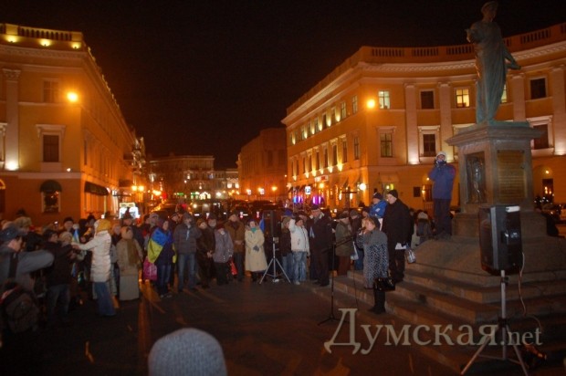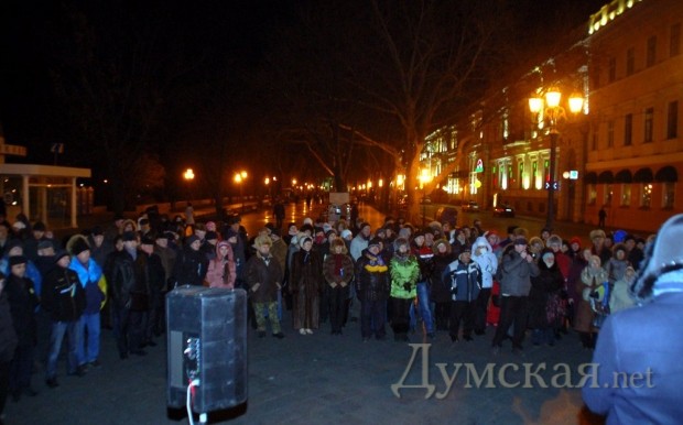 В Одессе продолжаются ежедневные собрания жителей города, поддерживающих киевский Евромайдан. Несмотря на холодную погоду, на митинги возле Дюка, которые традиционно проходят каждый день в шесть часов вечера, постоянно собирается несколько сотен одесситов.