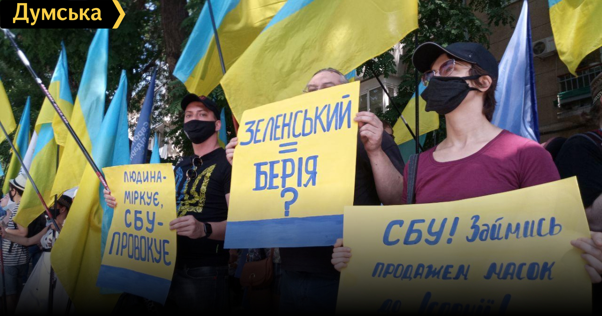 В руках держали плакаты с надписями: «Нет — зеленому террору», «Зеленский = Берия» и прочие.