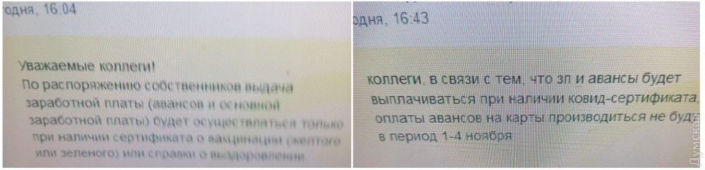 Сотрудников одного из одесских предприятий уведомили о том, что заработная плата им будет выплачиваться только при наличии сертификата о вакцинации против COVID-19.