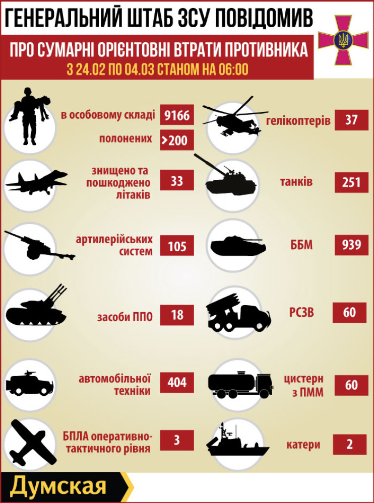 С 24.02 по 04.03 враг безвозвратно потерял 251 танк и 939 боевых бронированных машин, 105 артиллерийских систем и 50 реактивных систем залпового огня, 18 средств ПВО, 33 самолета и 37 вертолетов, 404 авто и 60 цистерн с горючим, два легких катера и 3 беспилотника оперативно-тактического уровня.