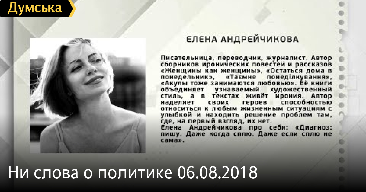 Елена Андрейчикова — писательница СМЕРТЬ РОССИЙСКИМ ОККУПАНТАМ! Заметили ошибку? Выделяйте слова с ошибкой и нажимайте control-enter Думская ТВ. Ни слова о политике (День на Думской):