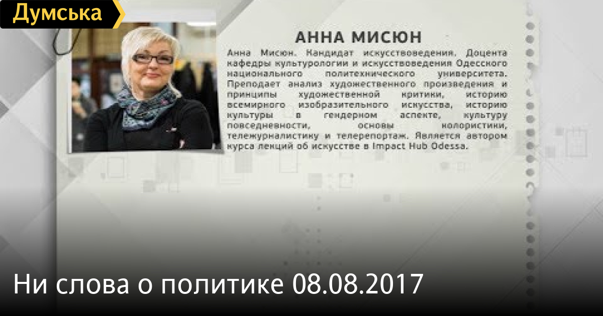 Авторская программа Марины Баканурской. В гостях Анна Мисюн, искусствовед СМЕРТЬ РОССИЙСКИМ ОККУПАНТАМ! Заметили ошибку? Выделяйте слова с ошибкой и нажимайте control-enter Думская ТВ. Ни слова о политике (День на Думской):