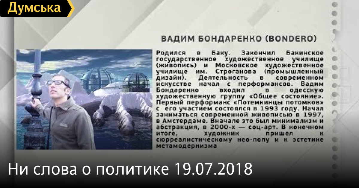 Вадим Бондаренко — художник СМЕРТЬ РОССИЙСКИМ ОККУПАНТАМ! Заметили ошибку? Выделяйте слова с ошибкой и нажимайте control-enter Думская ТВ. Ни слова о политике (День на Думской):