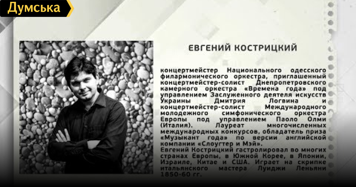 Евгений Кострицкий – скрипач СМЕРТЬ РОСІЙСЬКИМ ОКУПАНТАМ! Помітили помилку? Виділяйте слова з помилкою та натискайте control-enter Думская ТВ. Ни слова о политике (День на Думской):