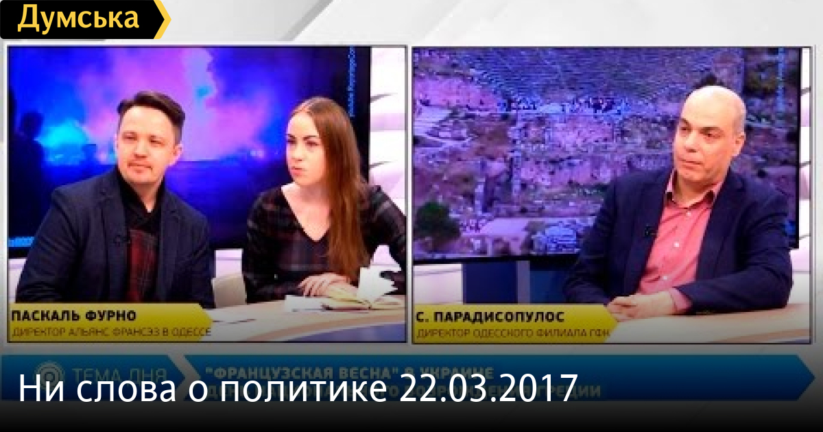 А также гость Паскаль Фурно (с переводчиком). Тема встречи:«Французская весна» в Украине СМЕРТЬ РОССИЙСКИМ ОККУПАНТАМ! Заметили ошибку? Выделяйте слова с ошибкой и нажимайте control-enter Думская ТВ. Ни слова о политике (День на Думской):