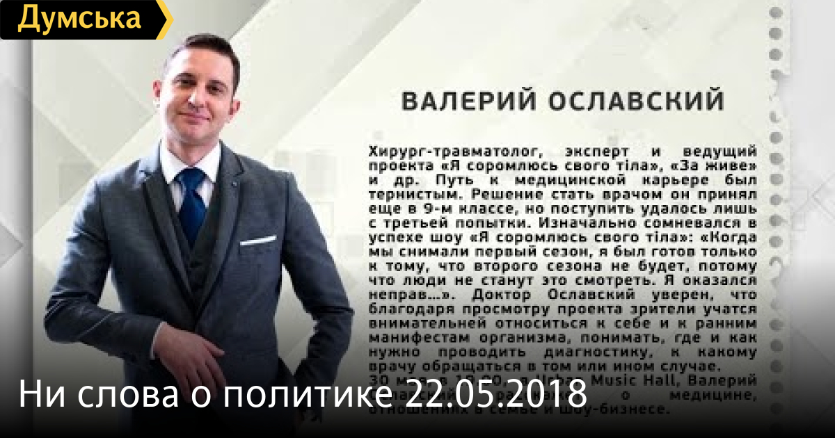 Валерий Ославский — доктор, телеведущий СМЕРТЬ РОССИЙСКИМ ОККУПАНТАМ! Заметили ошибку? Выделяйте слова с ошибкой и нажимайте control-enter Думская ТВ. Ни слова о политике (День на Думской):