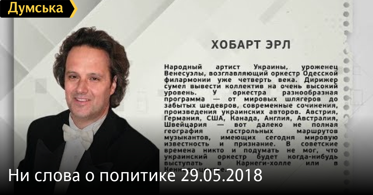 Хобарт Эрл, дирижер СМЕРТЬ РОССИЙСКИМ ОККУПАНТАМ! Заметили ошибку? Выделяйте слова с ошибкой и нажимайте control-enter Думская ТВ. Ни слова о политике (День на Думской):
