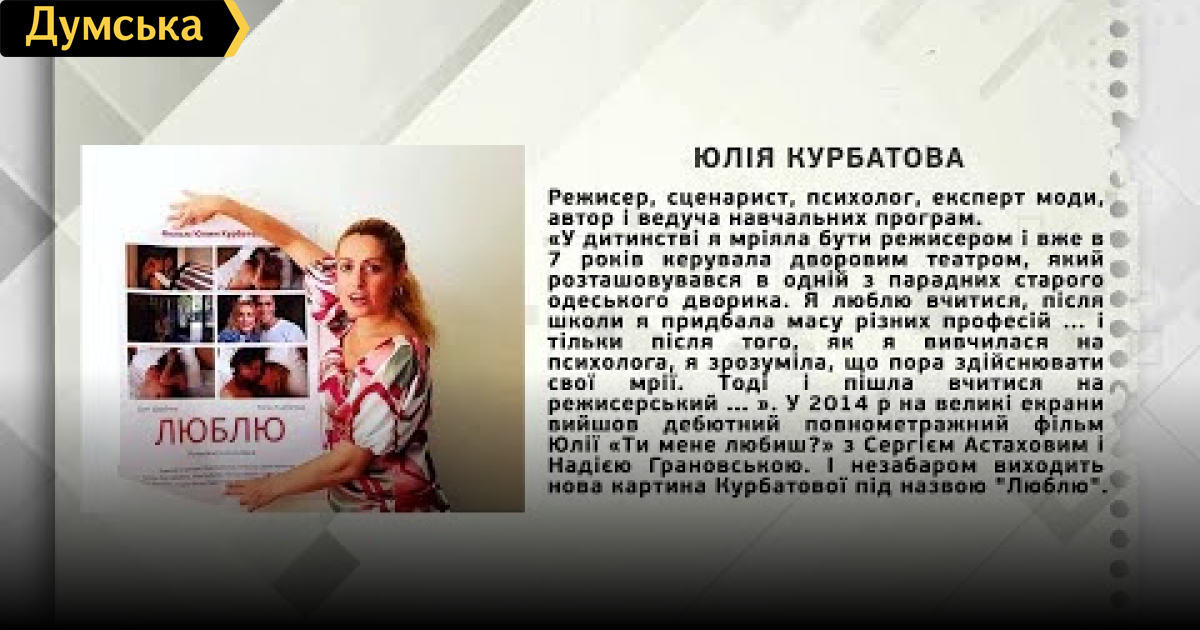 Юлия Курбатова — режиссер, сценарист СМЕРТЬ РОСІЙСЬКИМ ОКУПАНТАМ! Помітили помилку? Виділяйте слова з помилкою та натискайте control-enter Думская ТВ. Ни слова о политике (День на Думской):