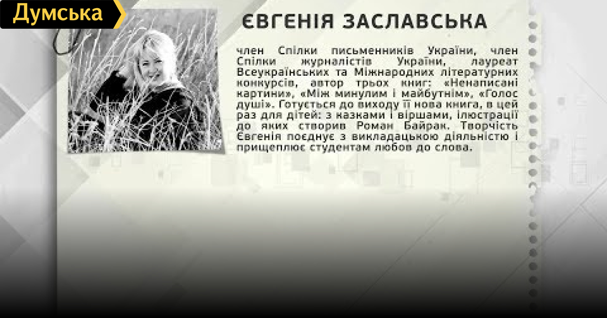 Евгения Заславская — поэтесса СМЕРТЬ РОСІЙСЬКИМ ОКУПАНТАМ! Помітили помилку? Виділяйте слова з помилкою та натискайте control-enter Думская ТВ. Ни слова о политике (День на Думской):