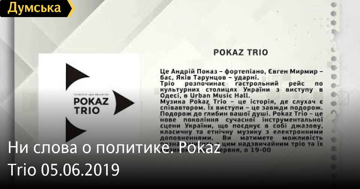 Андрей Показ — пианист, Яков Тарунцов — барабанщик СМЕРТЬ РОССИЙСКИМ ОККУПАНТАМ! Заметили ошибку? Выделяйте слова с ошибкой и нажимайте control-enter Думская ТВ. Ни слова о политике (День на Думской):