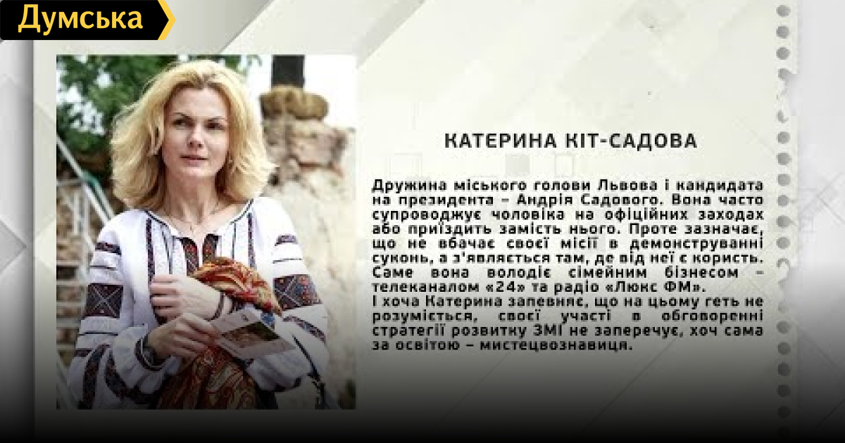 Катерина Кіт-Садова — дружина мера Львова СМЕРТЬ РОСІЙСЬКИМ ОКУПАНТАМ! Помітили помилку? Виділяйте слова з помилкою та натискайте control-enter Думская ТВ. Ни слова о политике (День на Думской):