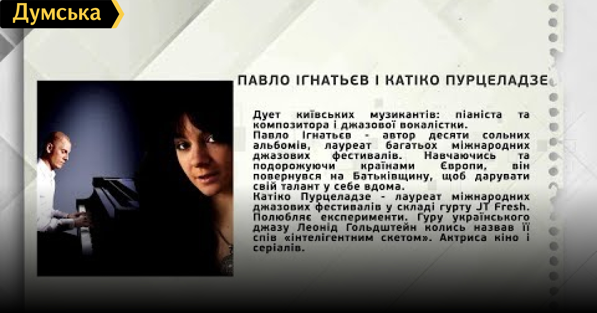 Павло Ігнатьєв – піаніст Катіко Пурцеладзе – вокалістка СМЕРТЬ РОСІЙСЬКИМ ОКУПАНТАМ! Помітили помилку? Виділяйте слова з помилкою та натискайте control-enter Думская ТВ. Ни слова о политике (День на Думской):