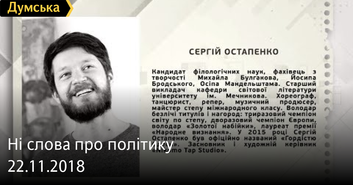 Сергій Остапенко — кандидат філологічних наук СМЕРТЬ РОССИЙСКИМ ОККУПАНТАМ! Заметили ошибку? Выделяйте слова с ошибкой и нажимайте control-enter Думская ТВ. Ни слова о политике (День на Думской):