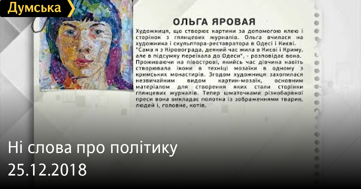 Ольга Яровая – художниця СМЕРТЬ РОССИЙСКИМ ОККУПАНТАМ! Заметили ошибку? Выделяйте слова с ошибкой и нажимайте control-enter Думская ТВ. Ни слова о политике (День на Думской):