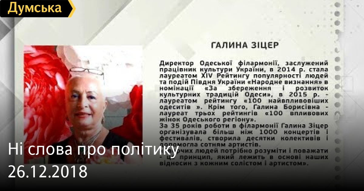 Галина Зіцер — директор філармонії СМЕРТЬ РОССИЙСКИМ ОККУПАНТАМ! Заметили ошибку? Выделяйте слова с ошибкой и нажимайте control-enter Думская ТВ. Ни слова о политике (День на Думской):