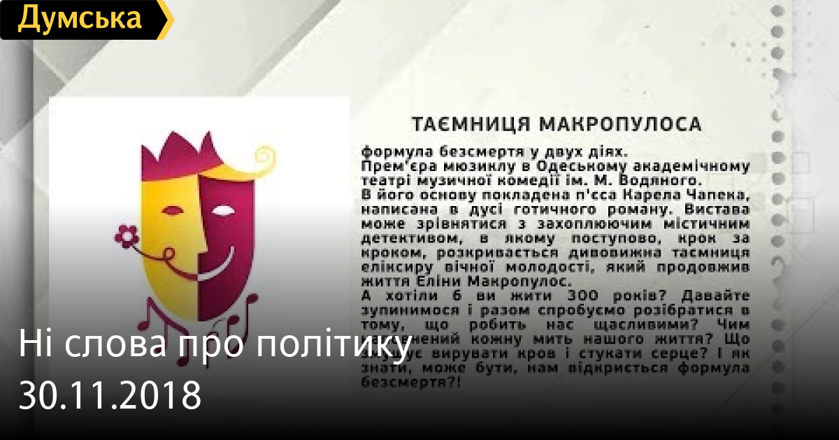 ТЕМА: ПРЕМ’ЄРА МЄЗИКЛУ “ТАЄМНИЦЯ МАКРОПУЛОСА» У МУЗКОМЕДІЇ
