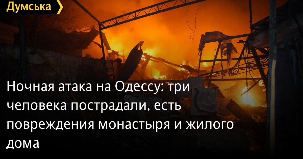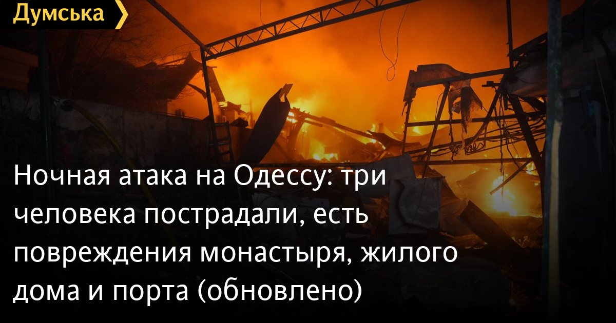Ночная атака на Одессу: три человека пострадали, есть повреждения монастыря и жилого домаТрое мужчин пострадали в результате ночной атаки врага на город. Есть повреждения гражданской и портовой инфраструктуры, сообщил глава ОВА Олег Кипер. На территории Свято-Успенского монастыря (Московский патриархат) возникло возгорание. Повреждены складские помещения, административные здания и автомобили. Поврежден также жилой дом. В больницу доставили 21-летнего мужчину с осколочными ранениями. Еще двум пострадавшим, 67 и 80 лет, медики оказали помощь на месте. У них диагностировали черепно-мозговые травмы, но от госпитализации они отказались. На месте работают все соответствующие службы. СМЕРТЬ РОССИЙСКИМ ОККУПАНТАМ! Заметили ошибку? Выделяйте слова с ошибкой и нажимайте control-enter |