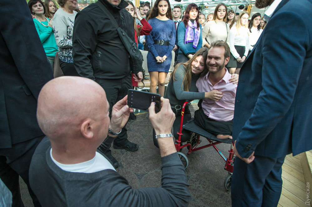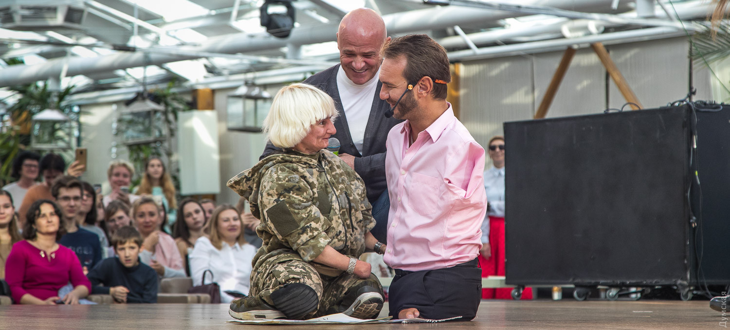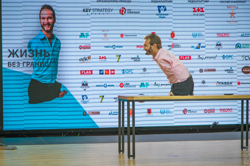 Известный австралийский мотивационный тренер Ник Вуйчич посетил сегодня Одесскую область и провел сразу четыре встречи. Родившийся без конечностей Ник, несмотря на долгий перелет, смог пообщаться с бизнесменами, рассказать о проблеме буллинга школьникам в «Садах Победы» и по просьбе губернатора Максима Степанова выступить перед студентами Одесской области. Заключительной точкой визита стало выступление перед многотысячным залом во Дворце спорта.