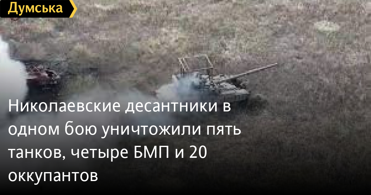 Миколаївські десантники в одному бою знищили п`ять танків, чотири БМП і 20 окупантів (відео)П'ять танків, чотири бойові машини піхоти та два десятки окупантів знищили в одному бою військовослужбовці 79-ї бригади десантно-штурмових військ. Воїни цього підрозділу виконують бойові завдання на донецькому напрямку, повідомляє командування ДШВ. «На світанку російські окупанти розпочали штурм позицій марунових беретів із Миколаєва. Аби досягти ефекту повної несподіванки, ворог застосував дими. Утім, розвідка вчасно помітила висування ворожої колони і артилерія десантників почала завдавати вогневої поразки противнику. Коли ворог підійшов на необхідну відстань, у бій вступили протитанкісти, які влучним вогнем із протитанкових ракетних комплексів почали палити техніку окупантів. Також у цьому бою десантники активно застосовували дрони-камікадзе та безпілотні літальні апарати зі скиданнями», — йдеться у повідомленні. СМЕРТЬ РОСІЙСЬКИМ ОКУПАНТАМ! Помітили помилку? Виділяйте слова з помилкою та натискайте control-enter |