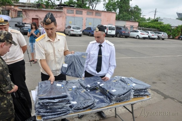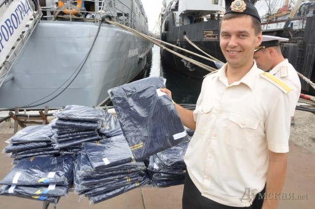 Как сообщили в командовании ВМСУ, униформу морякам в Одессу доставил и вручил почетный президент Николаевского морского порта Василий Капацина.
