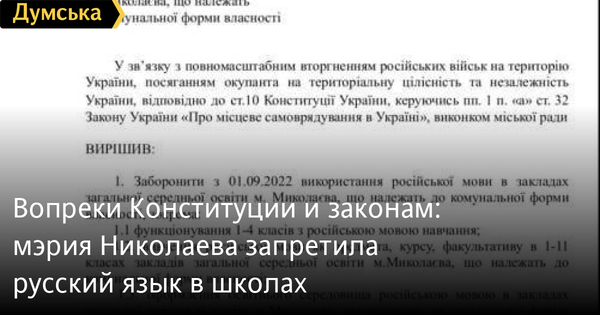 Отметим, что принятое решение противоречит как Конституции, так и целому ряду законов Украины, в частности «Об образовании», «О полном общем среднем образовании», «Об обеспечении функционирования украинского языка как государственного» и «О местном самоуправлении».