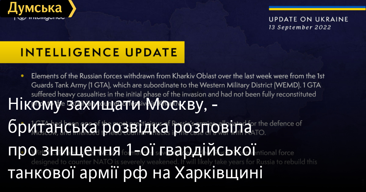 Британські аналітики заявляють, що виведені протягом останнього тижня з Харківської області частини російських військ були зі складу 1-ої гвардійської танкової армії, підпорядкованій Західному військовому округу.