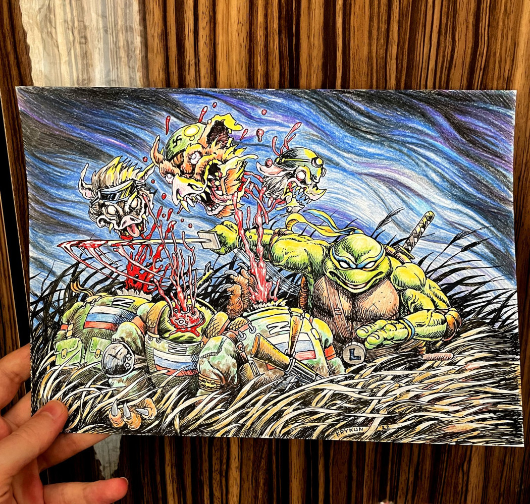 Ниндзя-Черепашки вышли на тропу войны: украинский художник проводит благотворительный аукционКиевский художник Сергей Крикун выставил на аукцион свою картину, на которой Черепашки-ниндзя кромсают российских захватчиков. Таким образом художник, известный своими иллюстрациями к иностранным книгам, продолжил давнюю традицию героев комиксов, которые в трудные для страны годы выходят на битву с общим врагом. Так, во времена Второй мировой супергерои боролись против нацистов. Супермен и Капитан Америка вместе с Баки, Нэмор и Чудо-Женщиной давали рисованному Гитлеру просто сказочных, неиллюзорных звездюлей. Комиксы, как консервы и патроны, регулярно поставляли на фронт, чтобы поднять настроение американских солдат. И вот теперь, 80 лет спустя, на помощь нашим солдатам приходят любимые бойцы — Черепашки-ниндзя. Средства от продажи картины будут направлены на поддержку Украинской армии. Поучаствовать в аукционе можно по ссылке. СМЕРТЬ РОСІЙСЬКИМ ОКУПАНТАМ! Помітили помилку? Виділяйте слова з помилкою та натискайте control-enter |