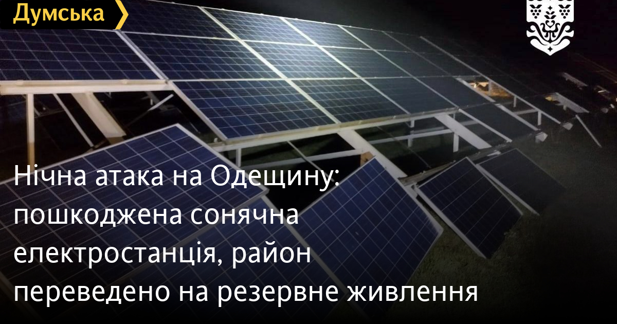 Нічна атака на Одещину: пошкоджена сонячна електростанція, район переведено на резервне живлення