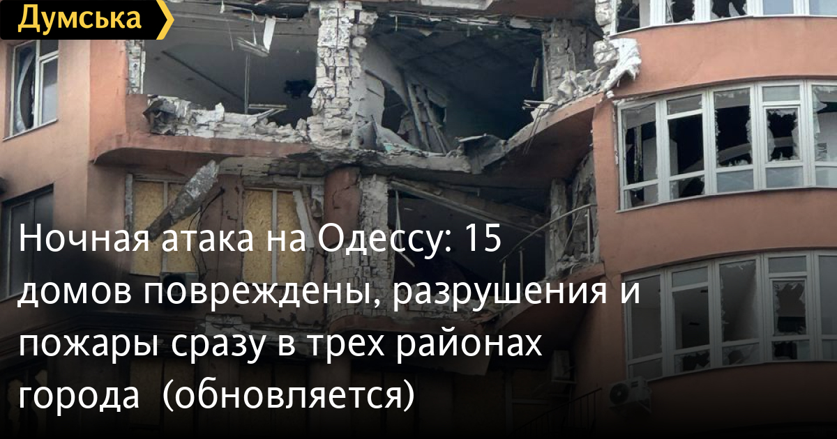Ночная атака на Одессу: 15 домов повреждены, разрушения и пожары сразу в трех районах города (обновляется)Попадание в многоэтажный дом, разрушения и пожары в трех районах города пережили одесситы после ночной атаки вражеских беспилотников. Как сообщили в Одесской ОВА, три человека пострадали. Двое находятся в больнице. Один из дронов-камикадзе попал в 22-этажный дом в Киевском районе — частично разрушены несколько квартир, повреждены фасад и остекление здания. Также повреждено общежитие одного из университетов — выбито 180 окон. Кроме того, под удар попала территория коммунального предприятия: повреждена часть оборудования и 11 транспортных средств. В Хаджибейском районе частично разрушен двухэтажный жилой дом. ОБНОВЛЕНО В 08:20 Как сообщили «Думской» в руководстве ОСМД 22-этажного дома в Киевском районе, дрон попал в 16 этаж. «Горючее с беспилотника, видимо, протекло ниже и загорелась квартира на 14 этаже. К счастью там никто не жил», — уточнили в компании. Пострадал житель квартиры на 16 этаже. Всего в доме 380 квартир. ОБНОВЛЕНО В 09:04 Жительница квартиры на 20-м этаже пострадавшего дома в Приморском районе Людмила рассказала, что находилась в квартире в момент удара. «Я как раз закончила на кухне, пошла в спальню, легла с телефоном — и вдруг мощный взрыв. Осколки, как пули, залетели в комнату. Мне повезло, что я была за двумя стенами», — рассказала она «Думской». По ее словам, в квартире выбило окна, сильно повреждены фасад и остекление, осколки разлетелись по комнатам, повреждены трубы и техника, двери в санузел перестали закрываться, упали плафоны, внутри до сих пор ощущается запах гари. По словам сотрудницы управляющей компании дома, пожар удалось локализовать силами самих жильцов. Соседи оперативно воспользовались пожарными рукавами, которые находятся в специальных шкафах и регулярно проверяются. «У нас все оборудовано — шланги всегда на месте, их обслуживают. Люди быстро сориентировались и начали тушить сами», — отметила она. По предварительной информации, беспилотник попал в район 18-го этажа, а серьезного распространения огня удалось избежать именно благодаря оперативным действиям жильцов. ОБНОВЛЕНО В 09:10 Прокуратура открыла уголовное производство по факту ночной атаки на Одессу: действия российских военных квалифицированы как военное преступление (ч. 1 ст. 438 УК Украины). По данным следствия, в результате обстрела частично разрушены трехэтажный и двухэтажный жилые дома, повреждены квартиры в высотках. Также повреждено более 20 автомобилей. В результате атаки пострадали три человека: 46-летняя и 69-летняя женщины госпитализированы, 31-летнему мужчине оказана медицинская помощь на месте.