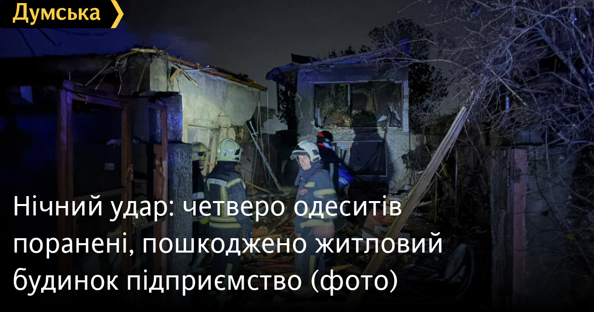 Нічний удар: четверо одеситів поранені, пошкоджено житловий будинок підприємствоЧетверо людей отримали поранення в результаті нічного удару по Одесі. Як повідомили в міській військовій адміністрації, троє з опіками та вибуховими травмами госпіталізовані, ще одному надали допомогу на місці. Пошкоджено житловий будинок і підприємство. Ліквідація наслідків триває. Всі відповідні служби на місцях. СМЕРТЬ РОСІЙСЬКИМ ОКУПАНТАМ! Помітили помилку? Виділяйте слова з помилкою та натискайте control-enter |