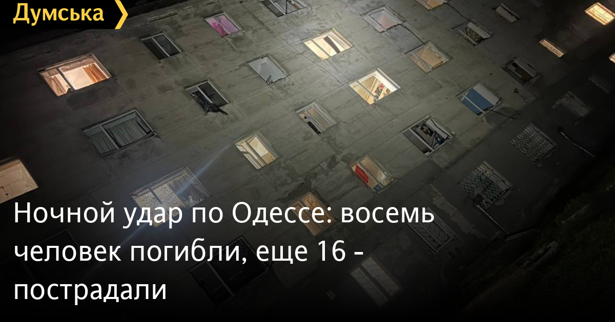 Ночной удар по Одессе: восемь человек погибли, еще 16 - пострадалиШесть человек погибли, а еще 11 - получили ранения в результате ночной атаки по Одессе. Как сообщил глава городской военной администрации Сергей Лысак, город пережил несколько волн атак ракетами и ударными БПЛА. «К сожалению, имеем шесть погибших людей. Мои самые искренние соболезнования родным и близким. Еще 11 человек пострадали, им оказывается вся необходимая медицинская помощь», — отметил он. Также повреждены объекты инфраструктуры и жилой дом в Хаджибейском районе, а взрывной волной в нескольких зданиях выбито более 300 окон. Кроме того, зафиксированы повреждения в одном из парков Приморского района. Коммунальные службы с ночи работают на местах для ликвидации последствий. Развернут оперативный штаб. ОБНОВЛЕНО в 7:45. По словам Сергея Лысака, количество погибших от ночной российской атаки возросло до семи. ОБНОВЛЕНО в 08:08. Глава ОГА Олег Кипер добавил, что количество пострадавших возросло до 12. В городе повреждены объекты портовой, критической и жилой инфраструктуры. Как минимум в трех многоэтажках разрушены фасадные стены и остекление, получило повреждения общежитие и прилегающие здания. ОБНОВЛЕНО в 08:25. Как сообщил Сергей Лысак, количество жарт атаки выросло до 8, пострадавших уже 16. СМЕРТЬ РОССИЙСКИМ ОККУПАНТАМ! Заметили ошибку? Выделяйте слова с ошибкой и нажимайте control-enter Новости по этой теме: |