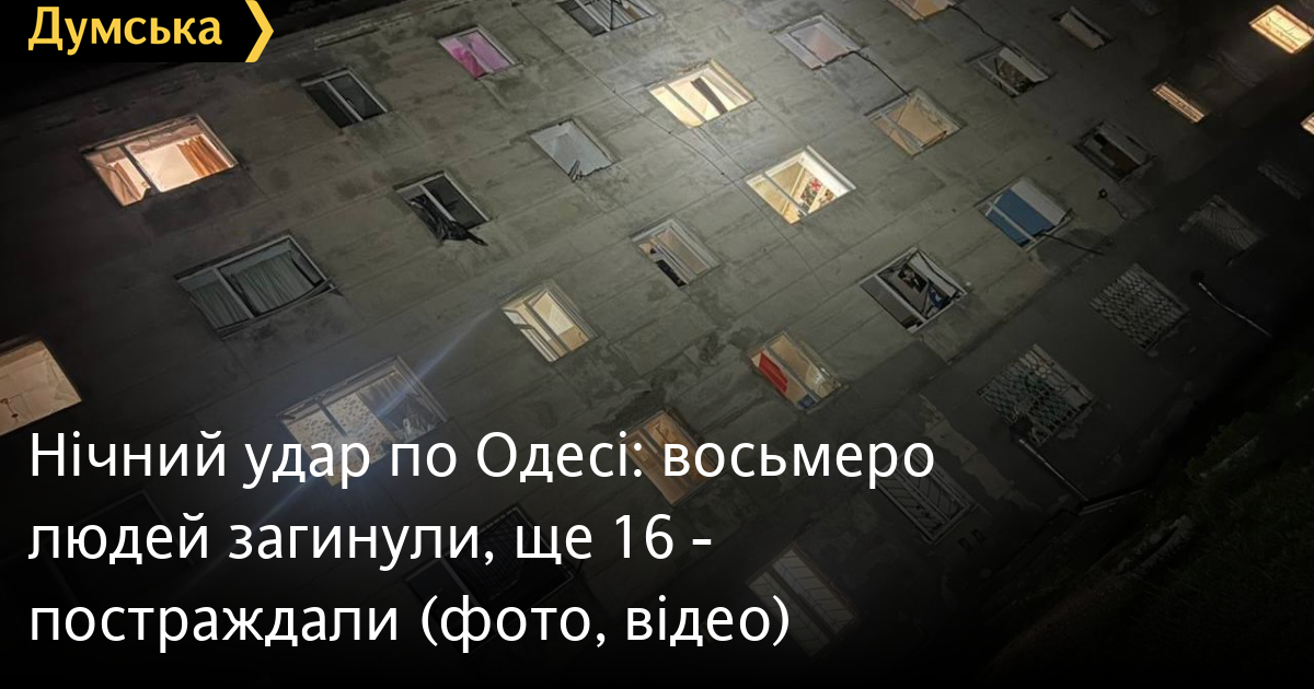 Нічний удар по Одесі: восьмеро людей загинули, ще 16 - постраждали (фото, відео)Шестеро людей загинули, а ще 11 - дістали поранення внаслідок нічної атаки по Одесі. Як повідомив голова міської військової адміністрації Сергій Лисак, місто пережило кілька хвиль атак ракетами та ударними БПЛА. «На жаль, маємо шість загиблих людей. Мої найщиріші співчуття рідним і близьким. Ще 11 людей постраждали, їм надається вся необхідна медична допомога», — зазначив він. Також пошкоджено об'єкти інфраструктури та житловий будинок у Хаджибейському районі, а вибуховою хвилею в кількох будівлях вибито понад 300 вікон. Крім того, зафіксовано пошкодження в одному з парків Приморського району. Комунальні служби з ночі працюють на місцях для ліквідації наслідків. Розгорнуто оперативний штаб. ОНОВЛЕНО о 7:45. За словами Сергія Лисака, кількість загиблих від нічної російської атаки зросла до семи. ОНОВЛЕНО о 08:08. Голова ОВА Олег Кіпер додав, що кількість постраждалих зросла до 12. У місті пошкоджено обʼєкти портової, критичної та житлової інфраструктури. У щонайменше трьох багатоповерхівках зруйновано фасадні стіни та скління, зазнав ушкоджень гуртожиток і прилеглі будівлі. ОНОВЛЕНО о 08:25. Як повідомив Сергій Лисак, кількість жертв атаки зросла до 8, постраждалих уже 16. СМЕРТЬ РОСІЙСЬКИМ ОКУПАНТАМ! Помітили помилку? Виділяйте слова з помилкою та натискайте control-enter Новини по цій темі: |