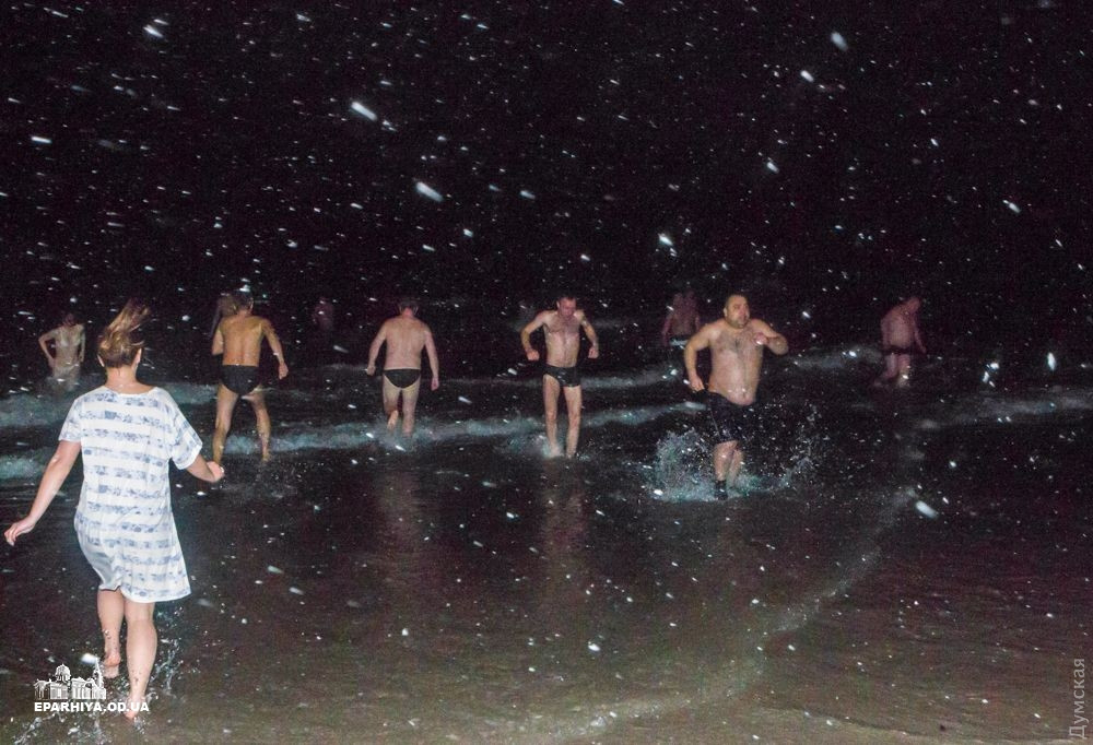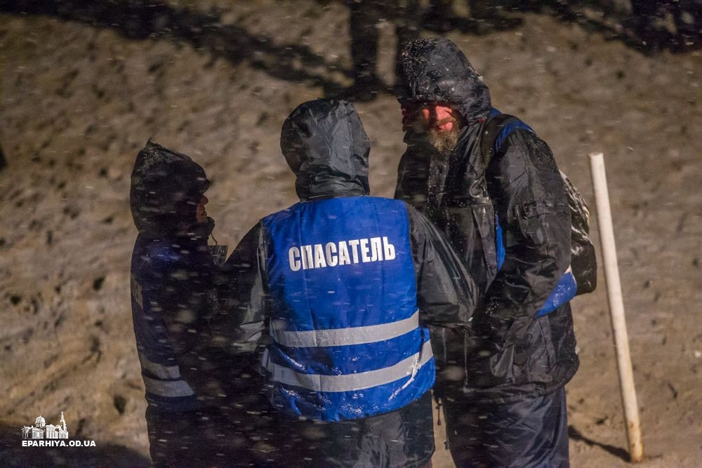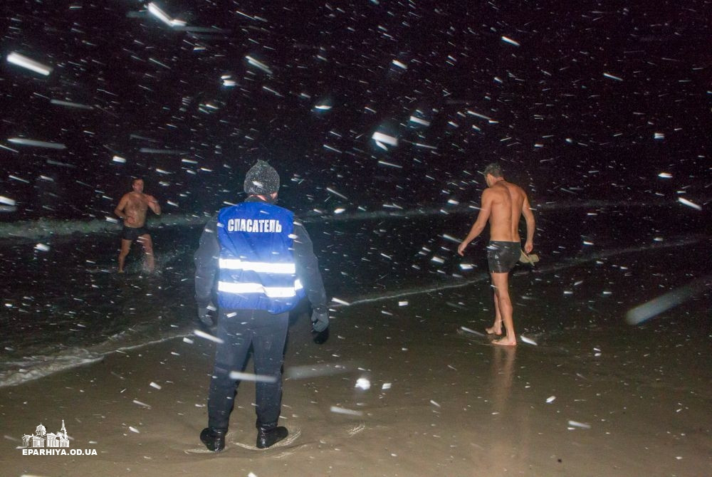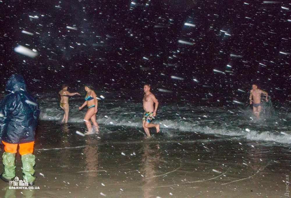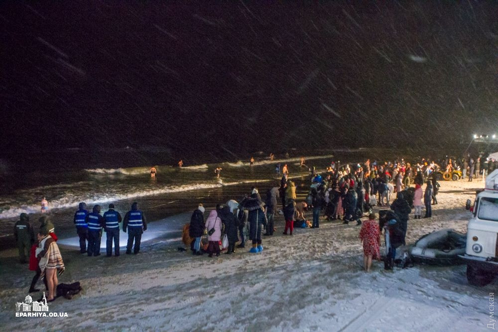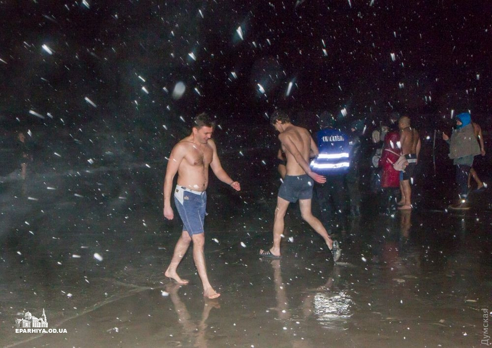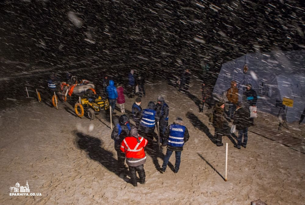 Несмотря на снегопад и холодный ветер, сотни одесситов собрались ночью на пляже «Золотой берег» на 16 станции Большого Фонтана — чтобы окунуться в освященную морскую воду и очиститься от грехов.
