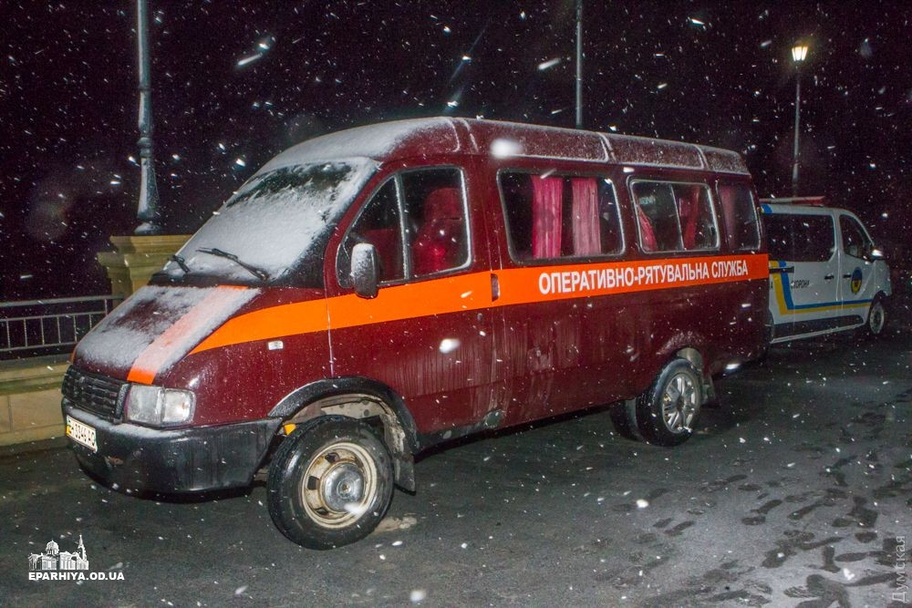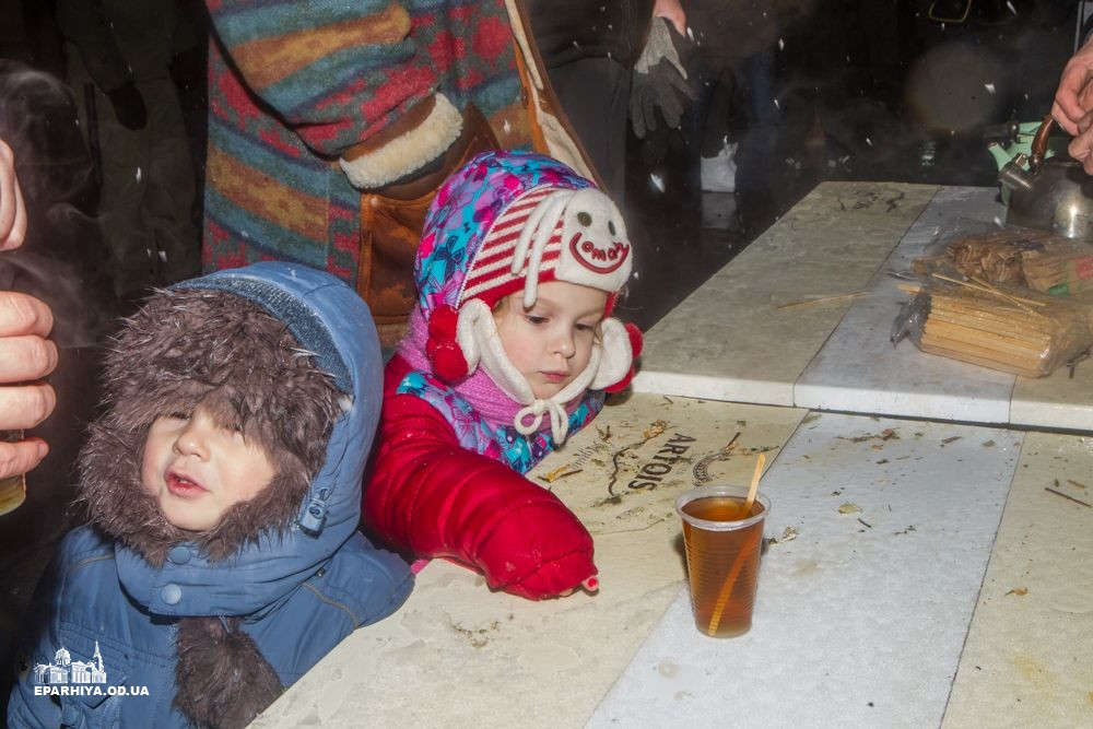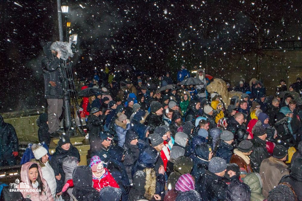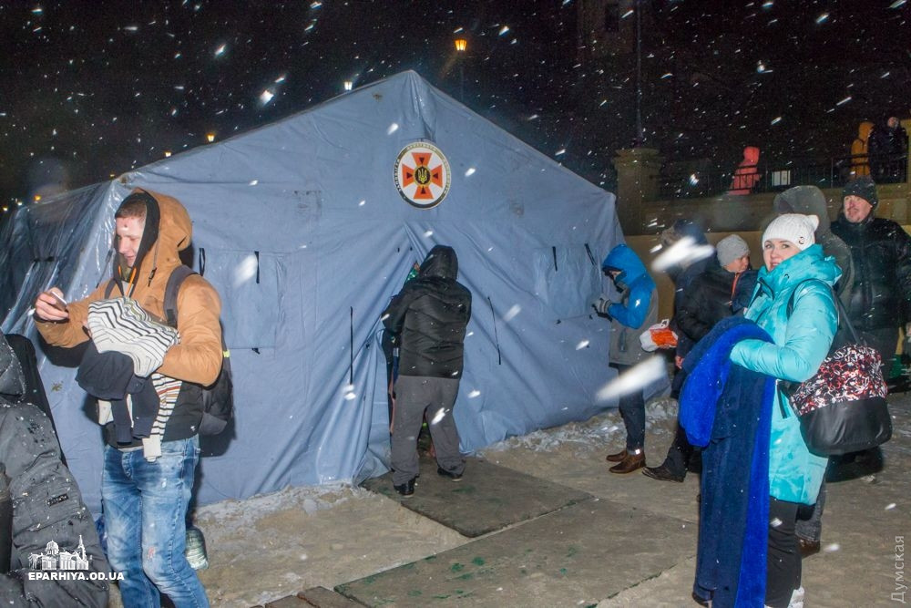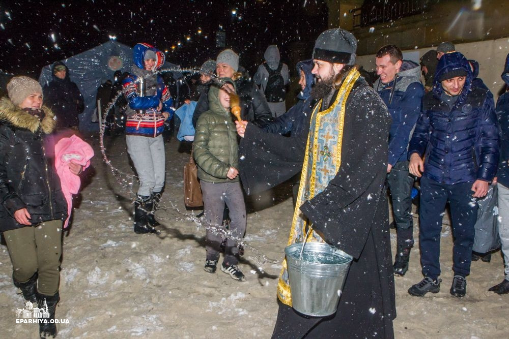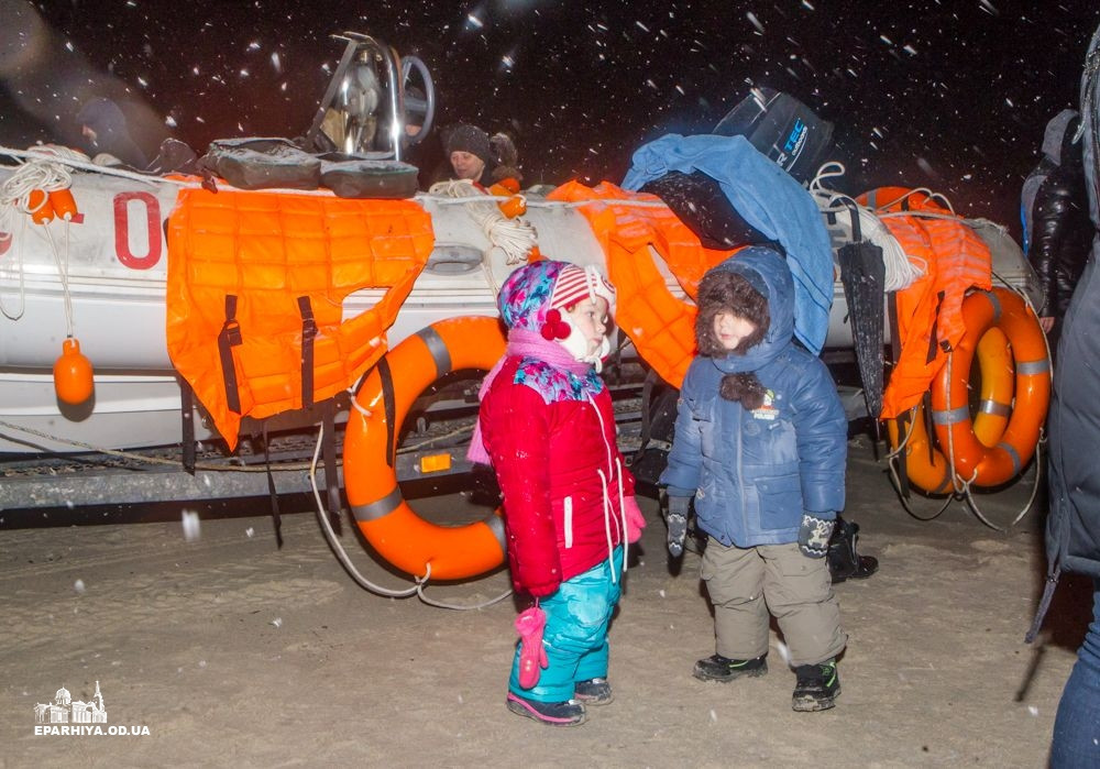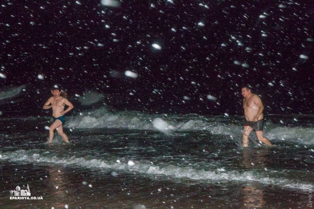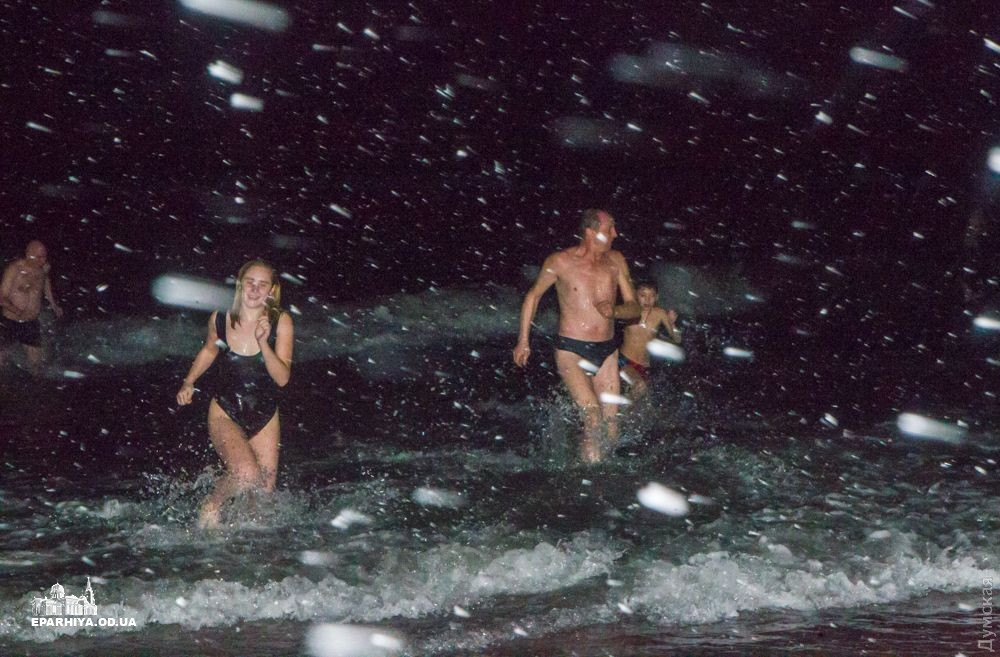 Несмотря на снегопад и холодный ветер, сотни одесситов собрались ночью на пляже «Золотой берег» на 16 станции Большого Фонтана — чтобы окунуться в освященную морскую воду и очиститься от грехов.