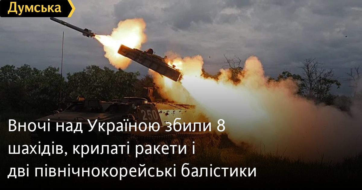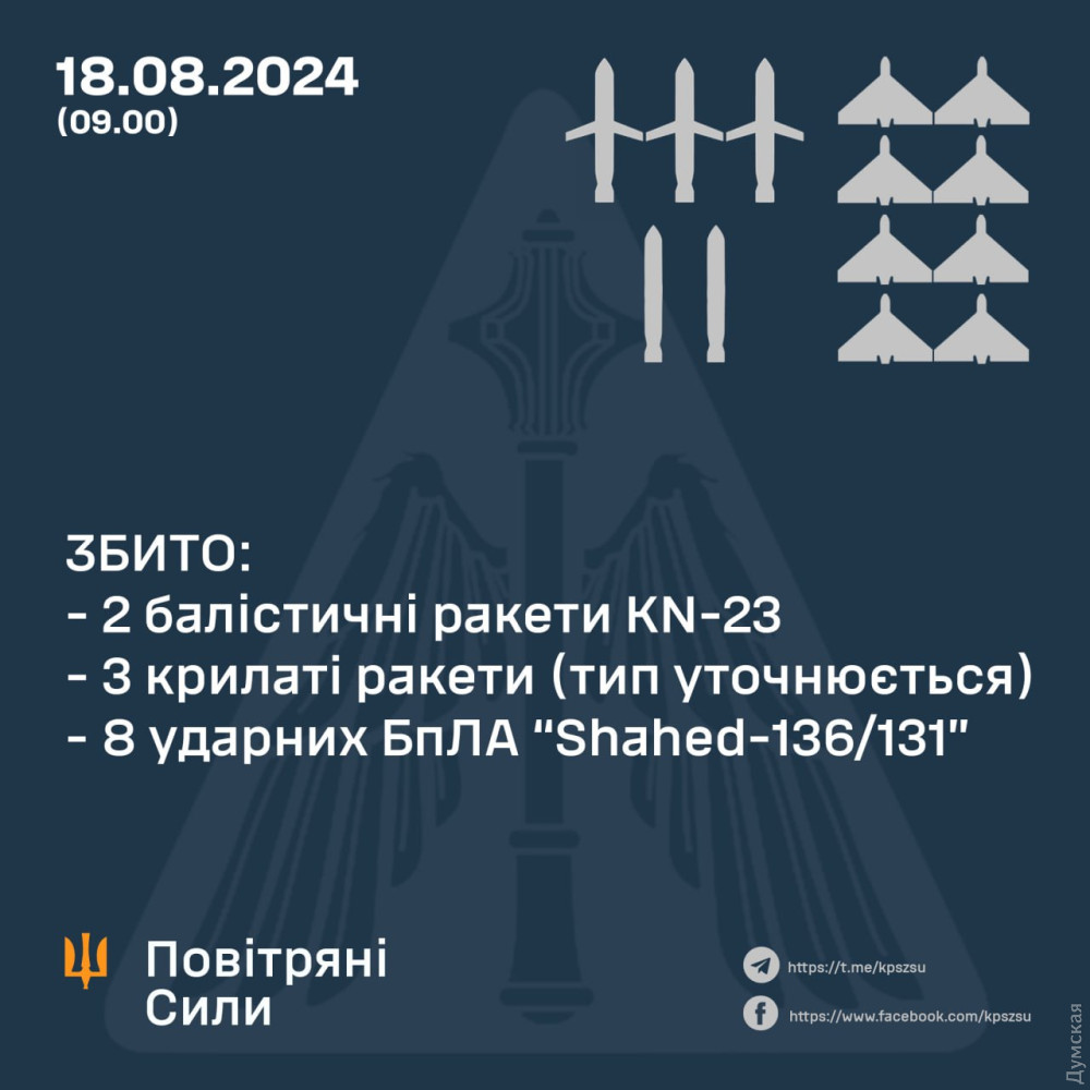 У Повітряних силах Збройних сил України повідомили, що окупанти запустили три балістичні ракети — один «Іскандер-М» і дві північнокорейські KN-23, дві авіаційні ракети Х-59, три крилаті ракети та вісім «шахідів».