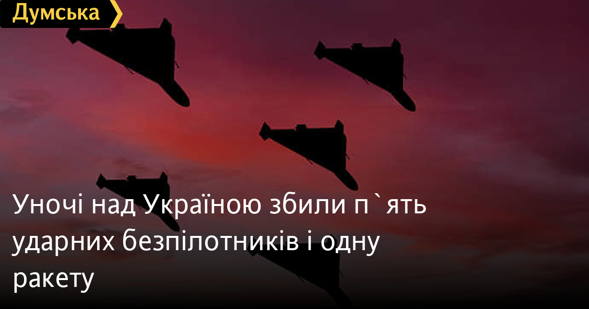 «Силами та засобами Повітряних Сил, у взаємодії з ППО Сил оборони України, знищено п'ять ударних БпЛА та одну керовану авіаційну ракету Х-59 у межах Дніпропетровської, Харківської, Миколаївської, Полтавської та Київської областей», — заявили в Повітряних силах.