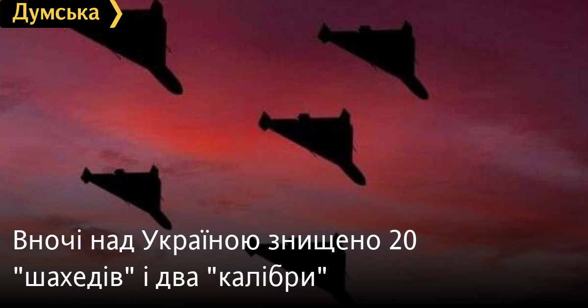 «У результаті бойової роботи всі 20 ударних дронів знищено, переважно на Київщині. Також на різних напрямках знищено дві крилаті ракети «Калібр». Щодо наслідків пуску ракети з ОТРК «Іскандер-М» інформація уточнюється», — наголосили в Повітряних силах.