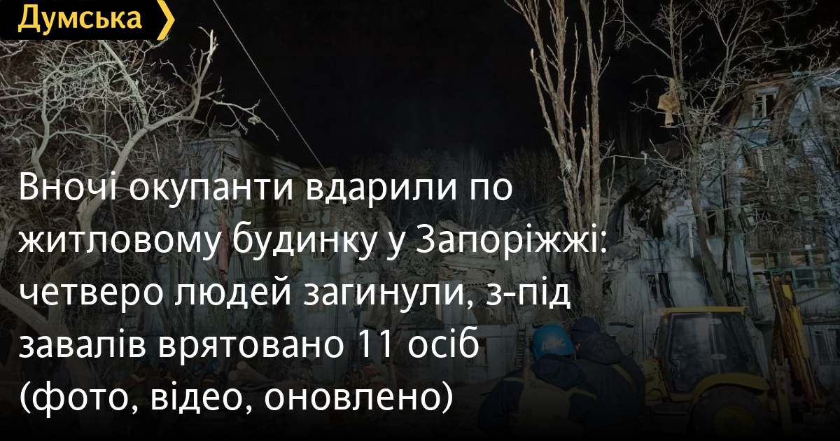 В ДСНС України розповіли, що станом на 06:30 на місці ракетного удару з-під завалів врятовано 11 осіб, з них одна вагітна жінка, ще 20 мешканців евакуйовано з сусіднього під'їзду.