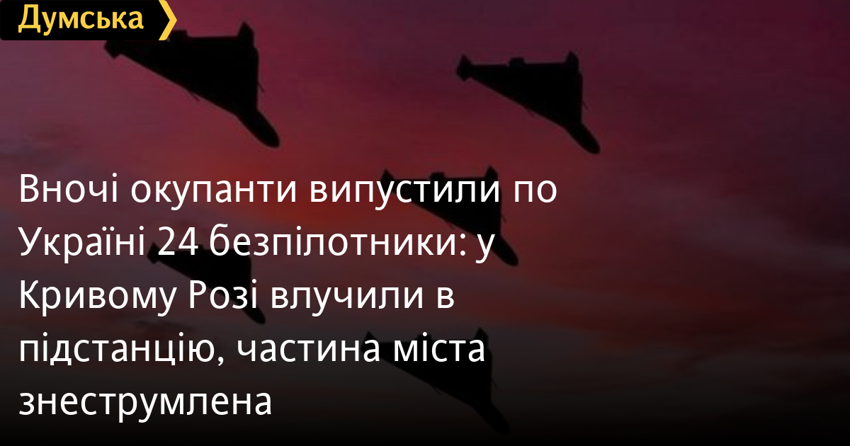 Мер Кривого Рогу Олександр Вілкул заявив, що ворожий «шахед» влучив в одну з міських підстанцій, унаслідок чого без електрики залишилося приблизно 100 тис. абонентів, зокрема частина лікарень, садочків і шкіл міста, лінія швидкісного трамвая, міського трамвая і тролейбуса.