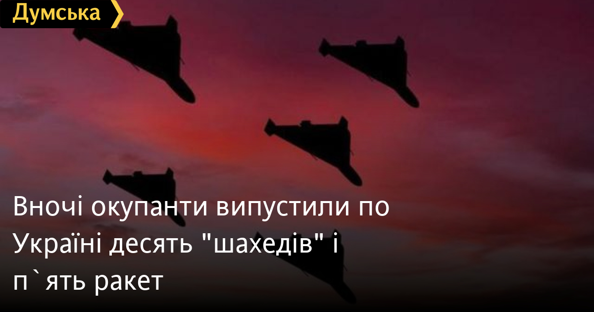 Десять ударних безпілотників Shahed-131/136 і п'ять ракет випустили вночі по території України російські окупанти.