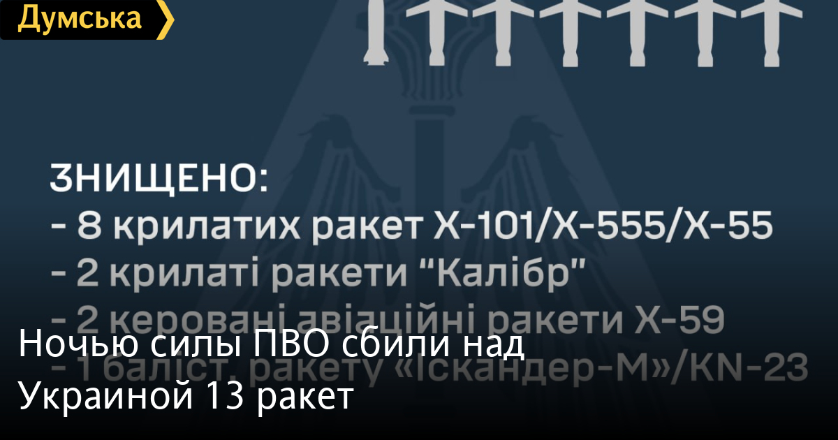 Вночі 15 лютого російські нацисти атакували Україну крилатими ракетами повітряного базування Х-101/Х-555/Х-55, морського базування – «Калібр», балістичними ракетами «Іскандер-М»/KN-23 (північнокорейський варіант), зенітними керованими ракетами С-300, керованими авіаційними ракетами Х-59. Як повідомили в командуванні повітряних сил, зафіксовано пуски 26 ракет різних типів. Сили ППО збили: вісім крилатих ракет Х-101/Х-555/Х-55, балістичну ракету «Іскандер-М»/KN-23, дві крилаті ракети «Калібр» та стільки ж керованих авіаційних ракет Х-59. СМЕРТЬ РОСІЙСЬКИМ ОКУПАНТАМ! Помітили помилку? Виділяйте слова з помилкою та натискайте control-enter |